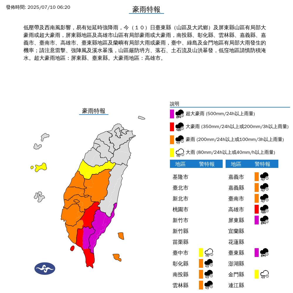 氣象署發布豪雨特報,屏東縣、台東縣要注意超大豪雨。(圖/氣象署)